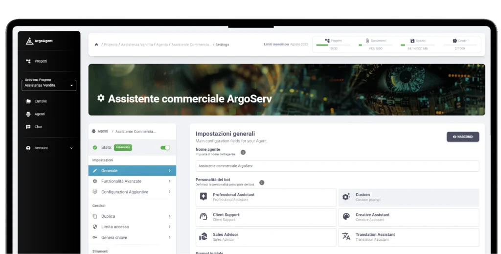 Quando sei pronto, puoi pubblicare l’agent, integrarlo con le API, con lo script sul tuo sito web, o utilizzando la nostra pagina dedicata. E decidi tu gli utenti a cui dare accesso.